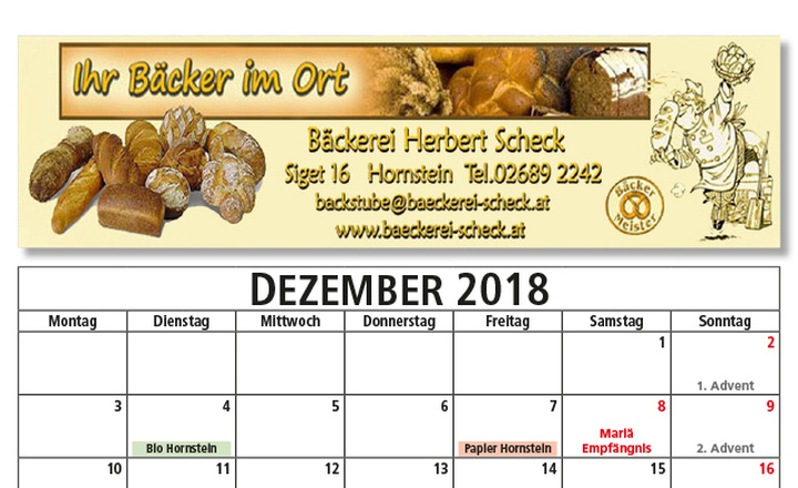Die Bilder am Dezember-Kalenderblatt zeigen typische Hornsteiner Adventveranstaltungen wie das Christbaumaufstellen mit unserer Partnergemeinde Gnesau, das Adventkonzert oder die Altenweihnachtsfeier der Gemeinde für Hornsteinerinnen und Hornsteiner ab dem siebzigsten Lebensjahr. Am kommenden 4. Adventsonntag bzw. ab Freitag veranstaltet der Tourismus- und Verschönerungsverein Hornstein die „Weihnacht im Föhrenwald“.